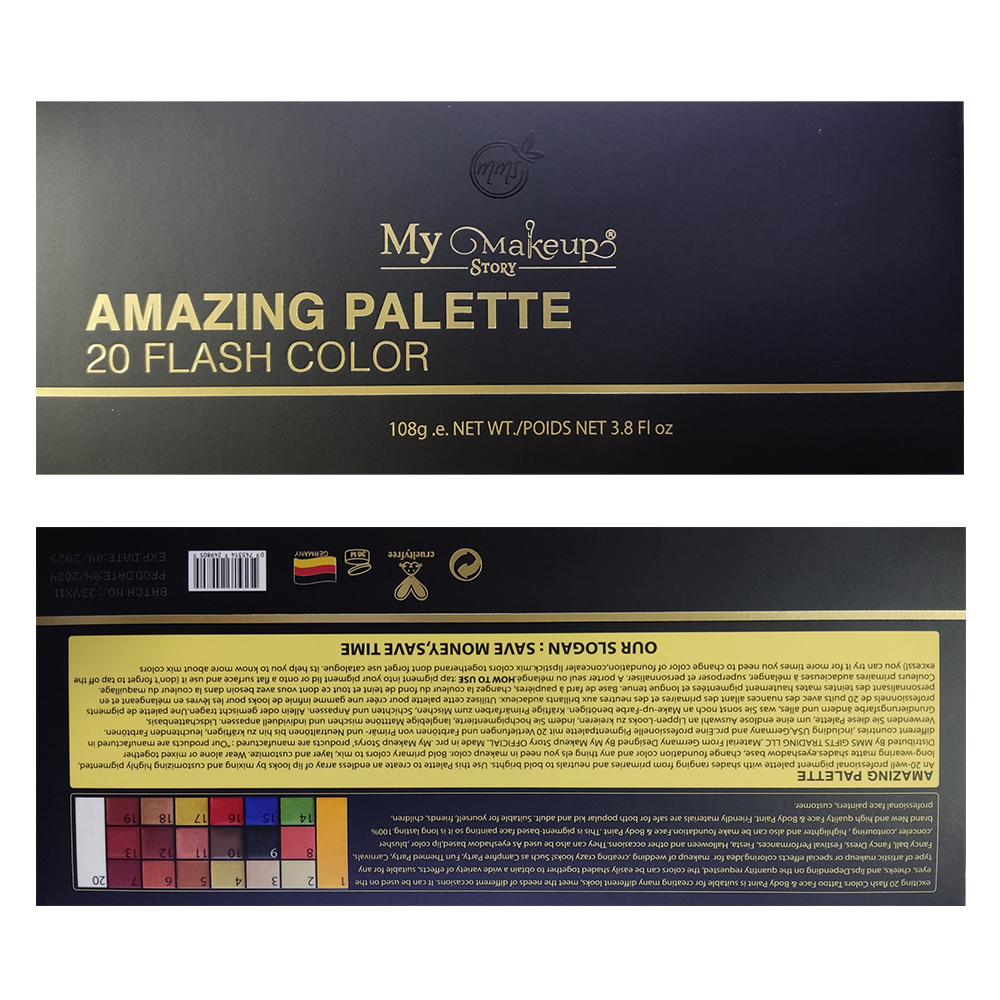 پالت رنگدانه جادویی مای میکاپ استوری یک پالت 20 رنگ با بافت کرمی و روغنی است که برای بدن و صورت، چشم و لبها قابل استفاده میباشد. قابلیت ترکیب رنگ دارد و یک پالت کامل و مناسب برای استفاده میکاپ آرتیستها و حتی استفاده شخصی است. پالت مای میکاپ دارای رنگهایی متنوع با رنگدانه و پیگمنت بالا است که از رنگهای کرم، قهوهای و نود برای کانتور، هایلایت صورت، سایه چشم و حتی رژ لب میتوان استفاده کرد؛ همچنین به عنوان زیر ساز سایه برای داشتن سایه چشمی با پیگمنت بالاتر نیز کاربرد دارد. از رنگهای شاین دار این پالت برای پشت پلک و به عنوان هایلایتر و از رنگهای قرمز، قهوه ای،بنفش و نارنجی برای رژ لب میتوان استفاده کرد. این پالت شما را برای انواع آرایشهای روزانه و مهمانی بی نیاز کرده و میکاپی زیبا و در عین حال طبیعی برایتان به ارمغان میآورد.